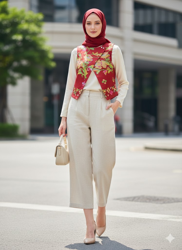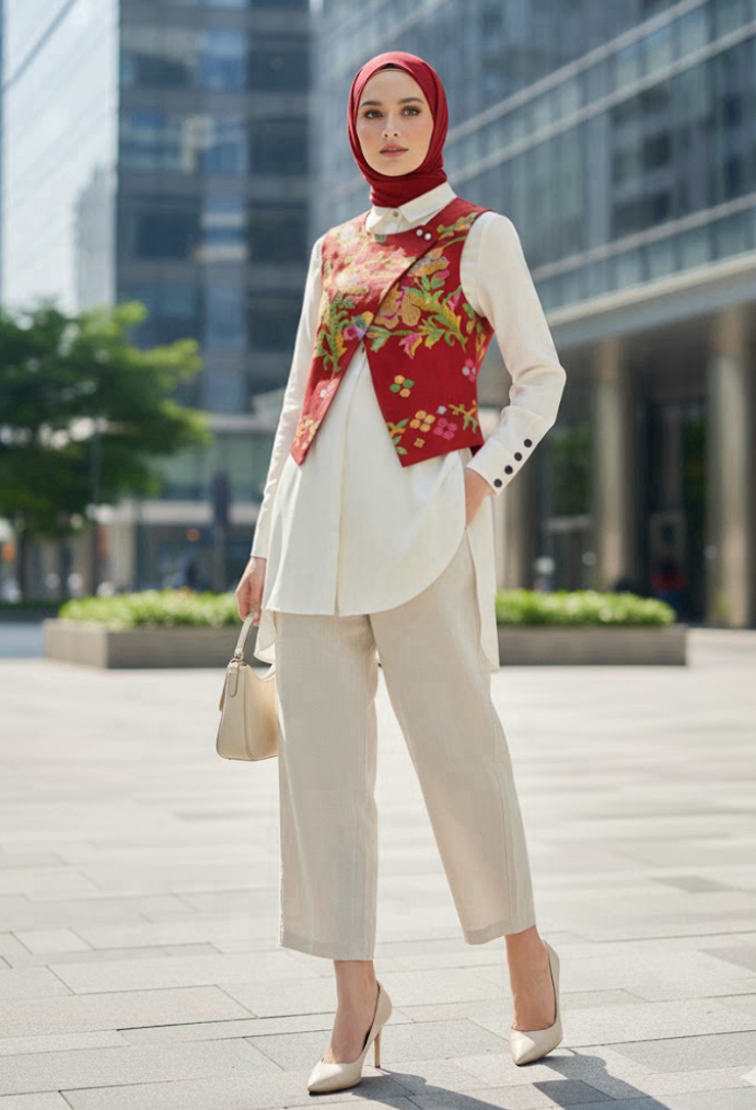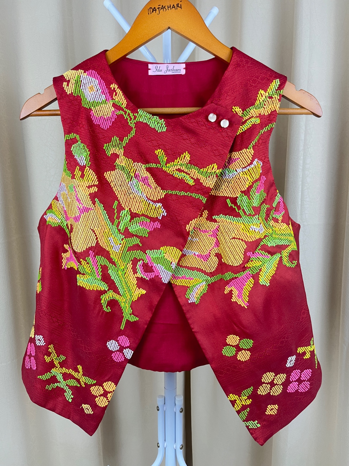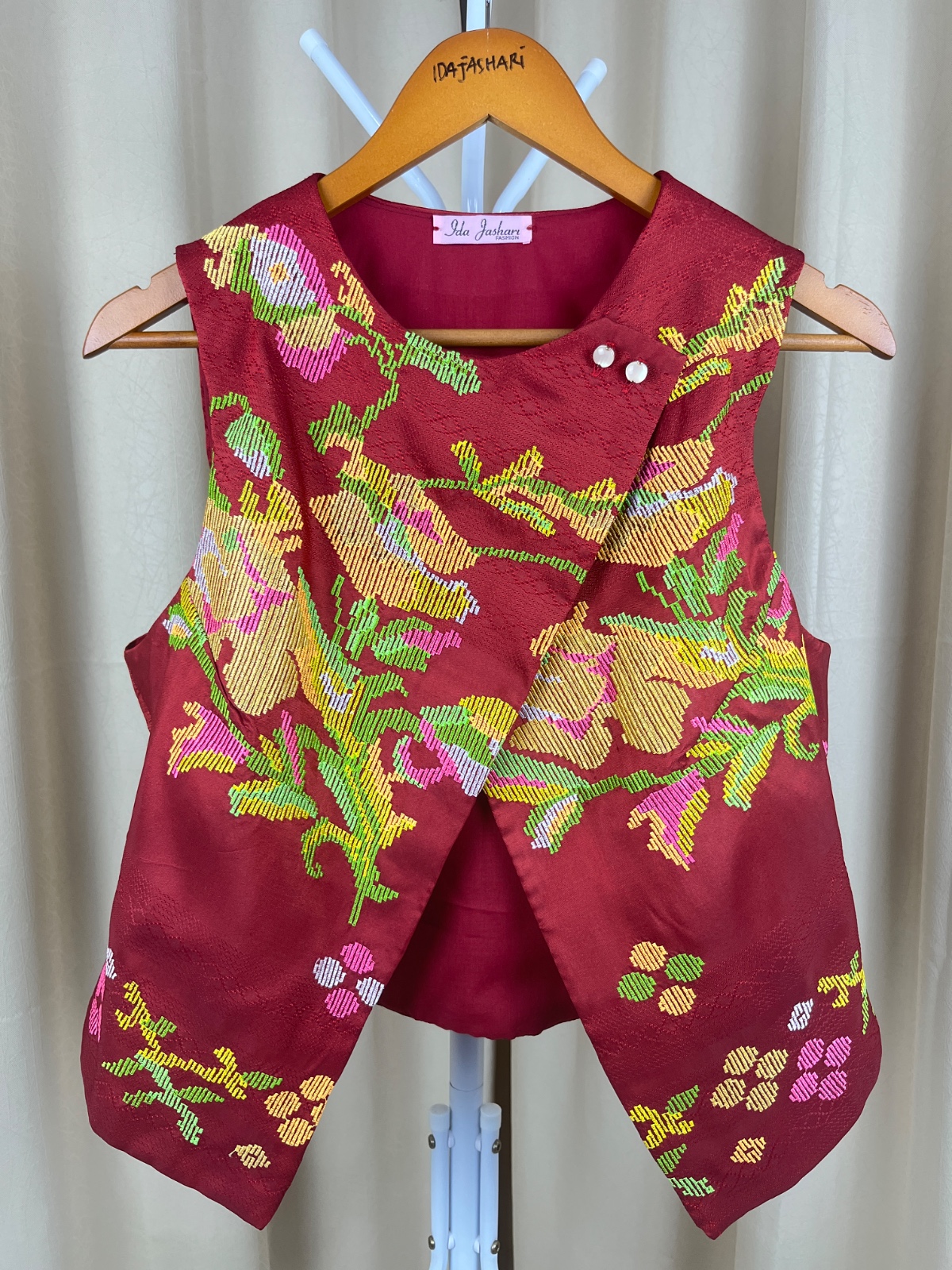 Motif Lagosi yang mewah dengan warna dasar merah ini sangat mudah dipadukan. Bisa layering di atas kemeja polos warna netral, celana kulot, atau bahkan dress panjang, dan look kalian akan langsung terlihat berkelas. Rompi ini memberikan struktur elegan tanpa membatasi gerakan!