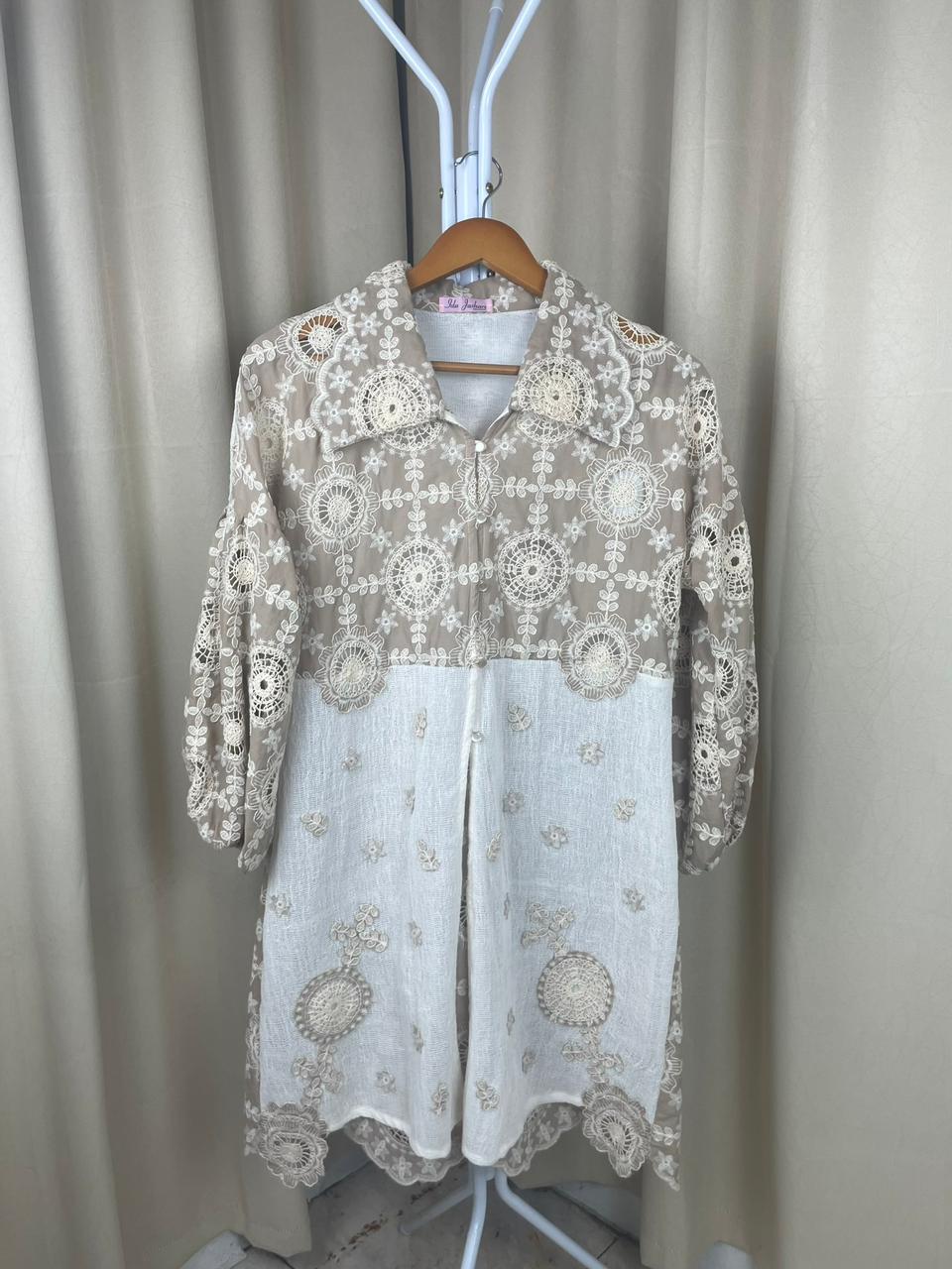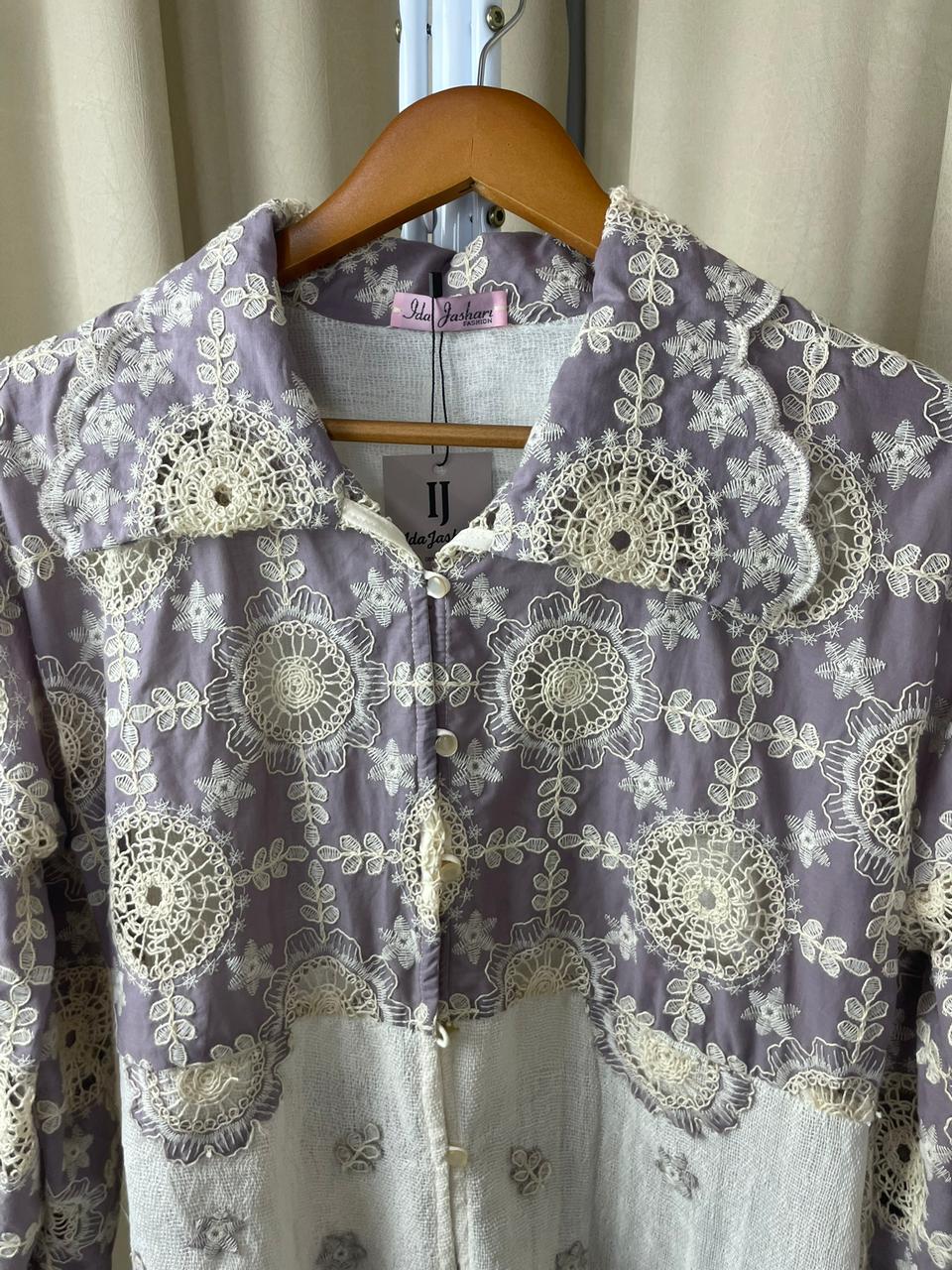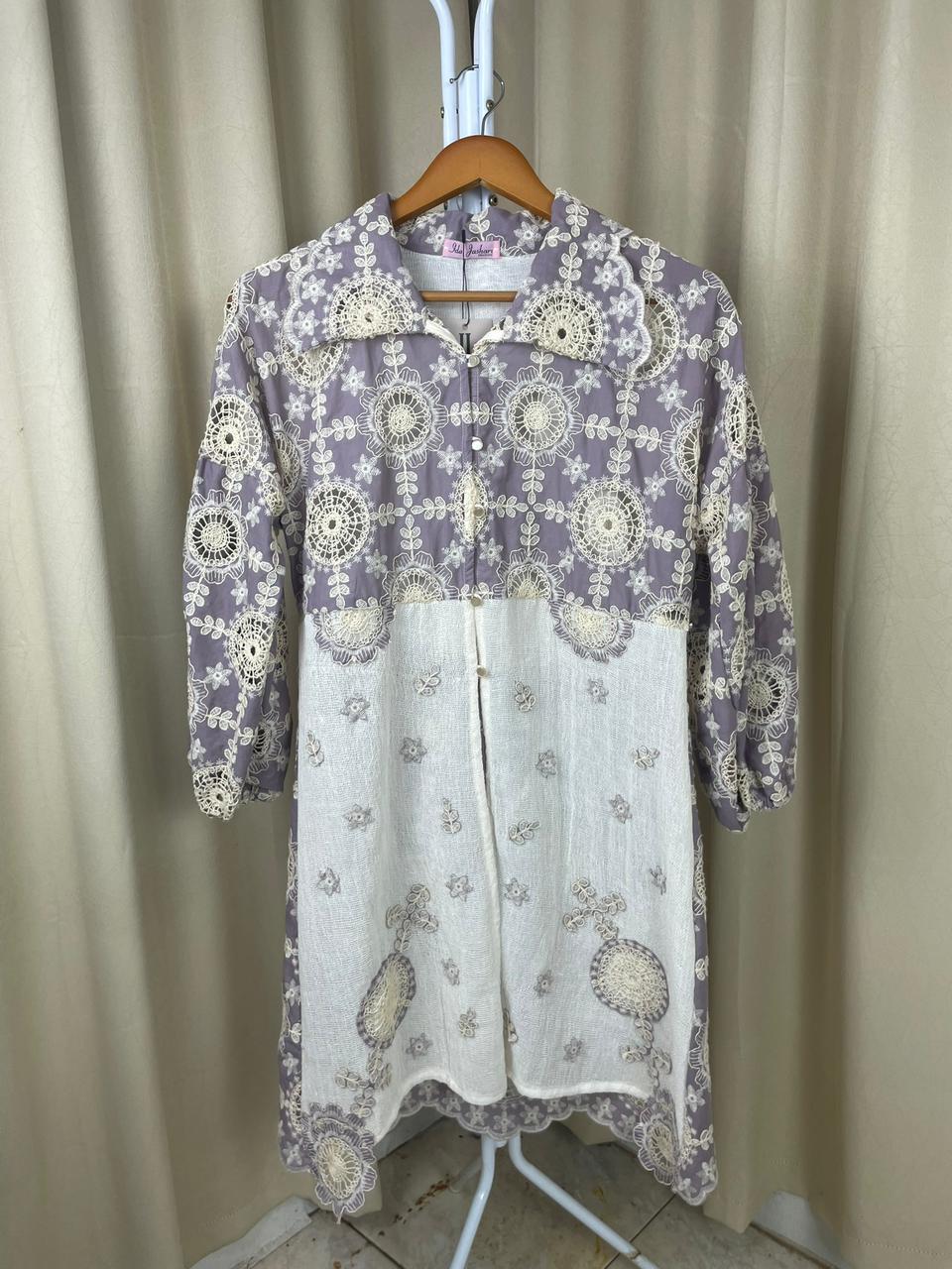 Desain elegan Tenun Tope (wastra Jeneponto) mix Katun Bordir dengan kombinasi dan potongan two-tone yang unik (Ungu – Putih BW dan Cream – Putih BW. Bagian lengan balon (puffy sleeve) menambah sentuhan modern dan feminin. Wajib punya untuk koleksi modest wear Anda!😍😍