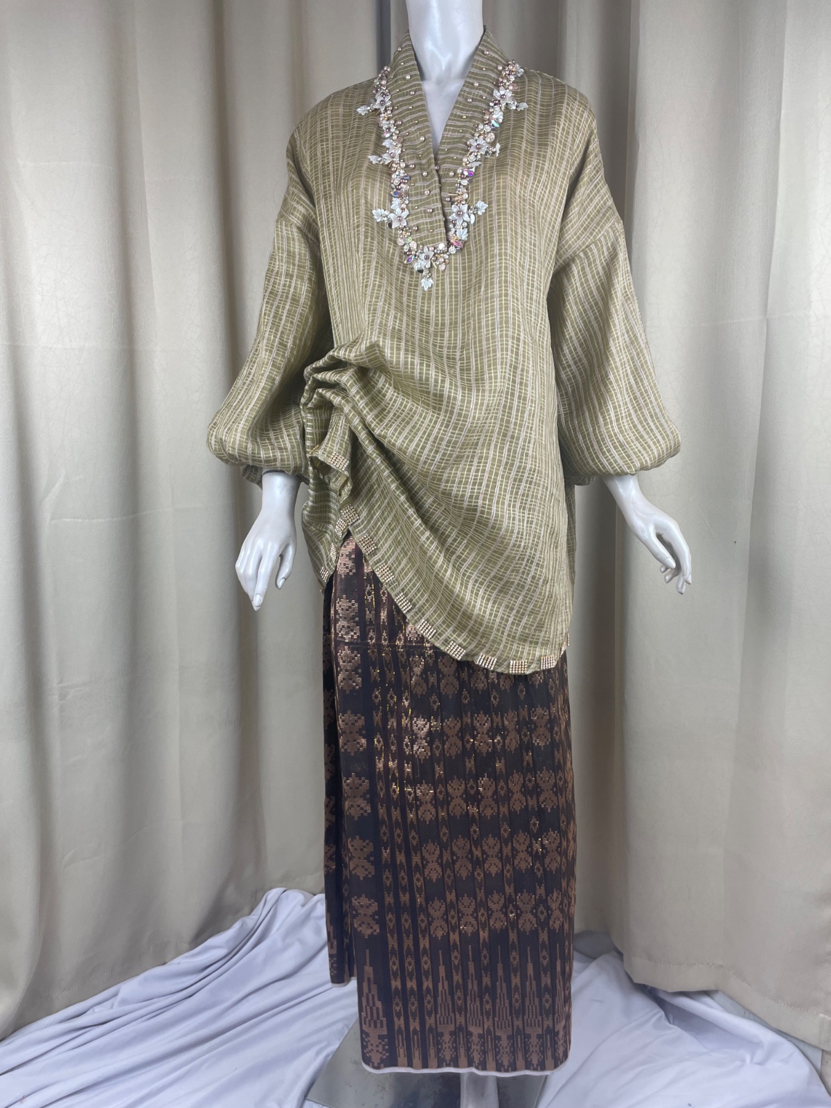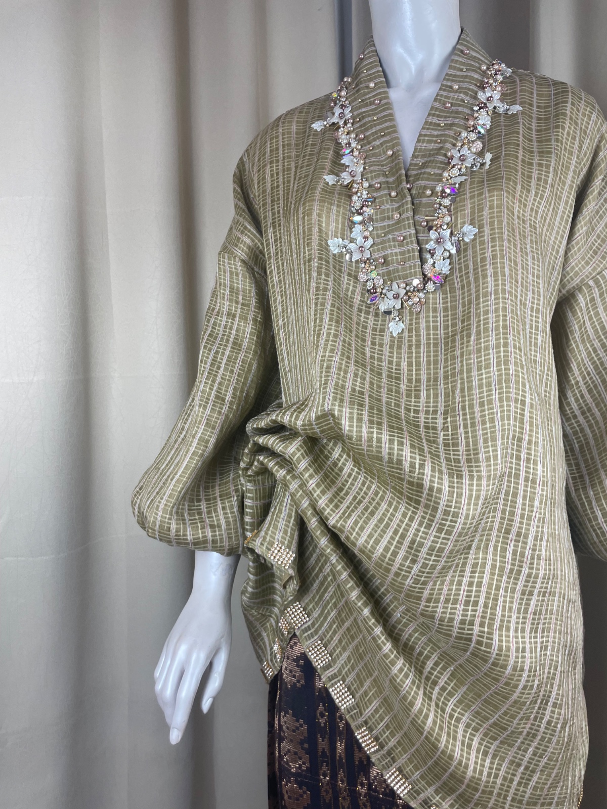 Baju bodo modifikasi ini terbuat dari Tenun Sutra Sengkang asli, memberikan kilau dan kenyamanan premium. Dihiasi detail payet yang cantik pada garis leher dan ujung baju, menambahkan sentuhan glamor.