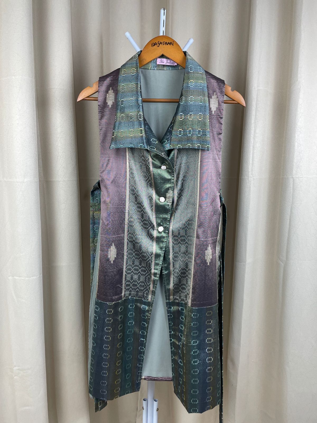 – *Kombinasi Elegan*: Vest tenun kristal dengan motif khas Sulawesi Selatan dipadukan dengan linen yang nyaman.